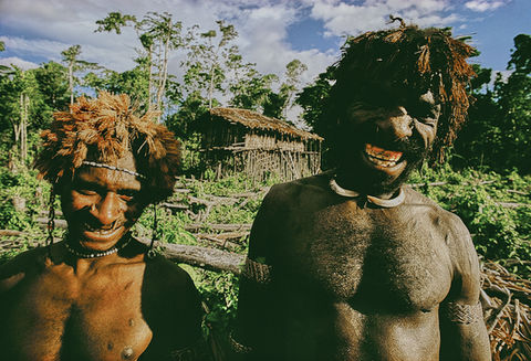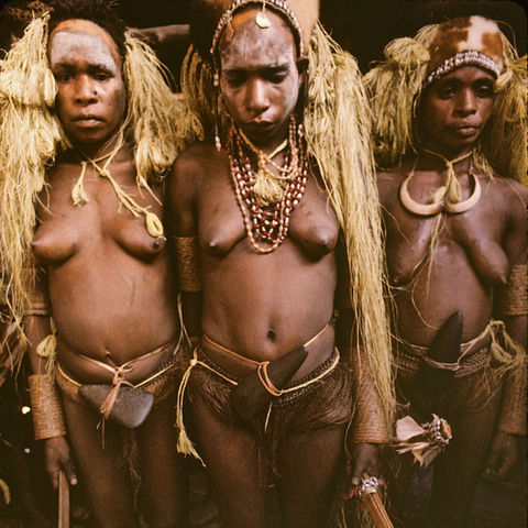 On another occasion, I witnessed an elaborate adoption ceremony intended to forge a bond between two rival villages. During the ritual, six adults – three men and three women – from one village underwent a symbolic birth before being adopted by members of the other. Each was decorated with strips of palm leaves and the three women were presented with bamboo food tongs, signifying their future obligation to feed their new parents once they came of age. They also wore symbolic umbilical cords fastened to stone axe heads around their waists.